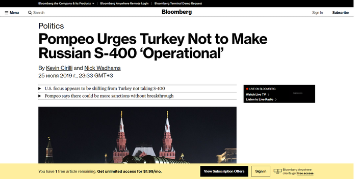 НЬЮ-ЙОРК, 26 июля. /ТАСС/. Вашингтон довел до сведения Анкары, что считает неприемлемым развертывание в Турции российских зенитных ракетных систем С-400, США могут ввести новые санкции. Об этом заявил госсекретарь США Майкл Помпео в интервью агентству Bloomberg, опубликованном в четверг.
