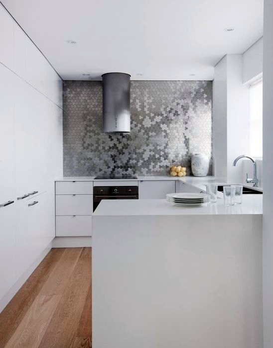 Белоснежная кухня с современным кухонным гарнитуром, встроенной техникой и акцентной стеной, украшенной зеркальной плиткой - прекрасное решение для любителей чистоты и современного дизайна.