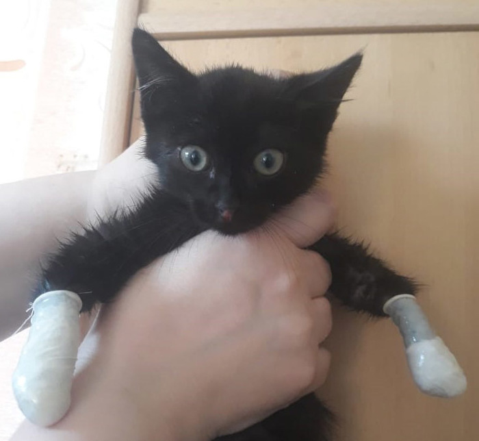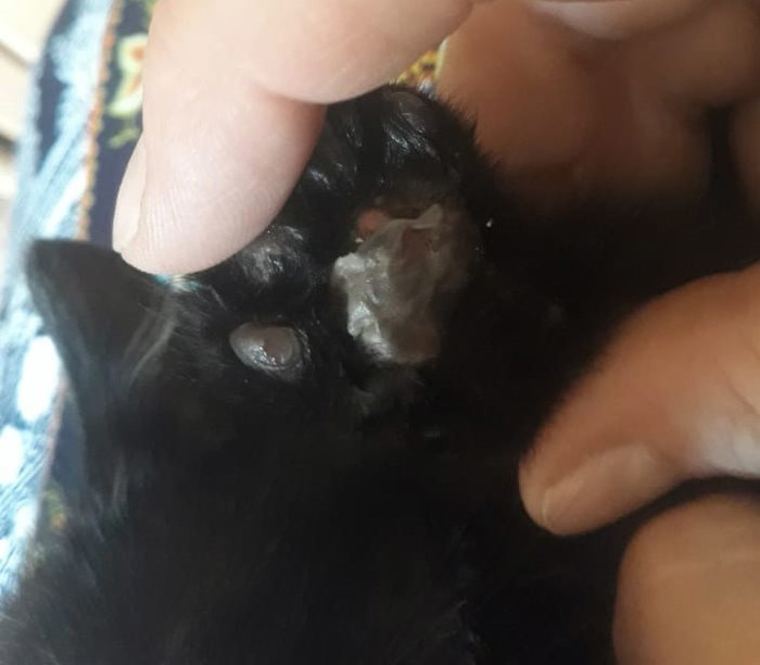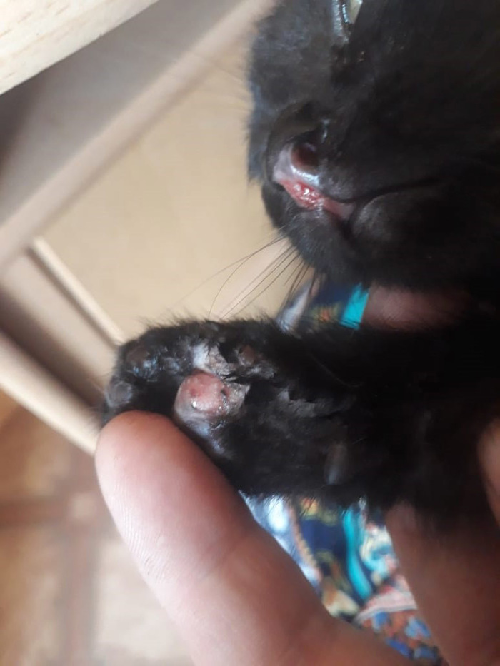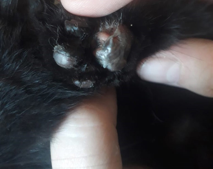 Вчера я увидела, что он стал прихрамывать на ту лапу, которая косолапила. При осмотре обнаружила, что на подушечке есть корочка, как от засохшей раны. Слегка надавив, поняла, что подушечка опухшая, так как она черная, то не понятно, какого цвета. Принюхавшись, поняла, что пахнет гноем. После осмотра всех лап, стало понятно, что везде подушечки припухшие, но особенно на передних. Ту, лапу, которая гноилась, обработала хлоргексидином, в процессе обработки обнаружила еще одно нагноение на подушечке под одним из ногтей, все обработала, наложила левомеколь и замотала. Посмотрела вторую переднюю лапу, подушечка была вспухшая, решила ее также обработать и наложить левомеколь. Подвижность котенка чуток ограничилась, он походил и заснул до утра. Аппетит в норме.