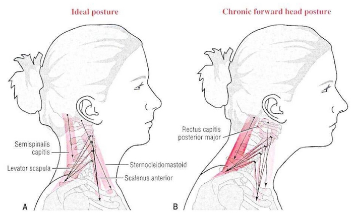 Слева видим самку человека здоровую - в городской среде не встречающуюся, а справа типичную представительницу подвида горбатых. Грудная клетка, закручена внутрь, плечи смотрят вперед, лопатки не касаются друг друга. Психосоматический позиция низко доминантной особи, желание сократится/спрятаться. Голова опущена - в поклоне. Если обращали внимание, то так делают собаки, когда боятся и хотят выразить признание чьей-то силы. Так же это поза ожидания удара, мышечный спазм запечатлел испуг. Мышцы шеи перетянуты, что является гарантией мышечных спазмов и пережимают ключевые артерии, по которым кровь поступает в мозг - но это далеко не самое страшное.