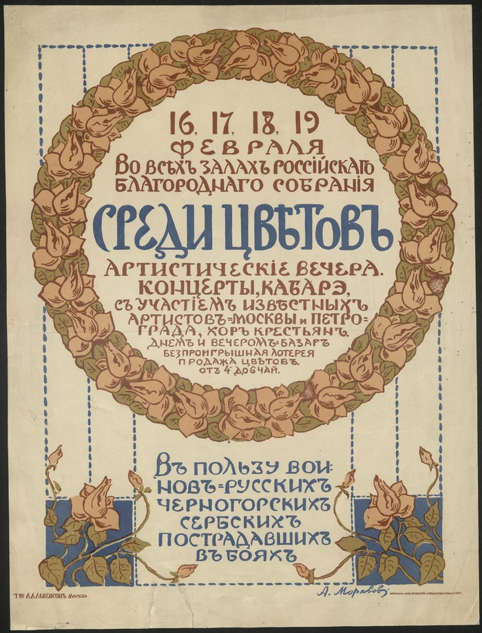 7. Среди цветов: 16, 17, 18, 19 февраля во всех залах Российского благородного собрания артистические вечера в пользу воинов - русских, черногорских, сербских, пострадавших в боях.