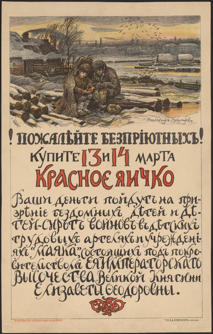 9. Пожалейте бесприютных! Купите 13 и 14 марта красное яичко. Ваши деньги пойдут на призрение бездомных детей и детей-сирот воинов в детских трудовых артелях и учреждениях "Маяка", состоящих под покровительством Ея Императорского Высочества Великой княгини Елизаветы Федоровны.