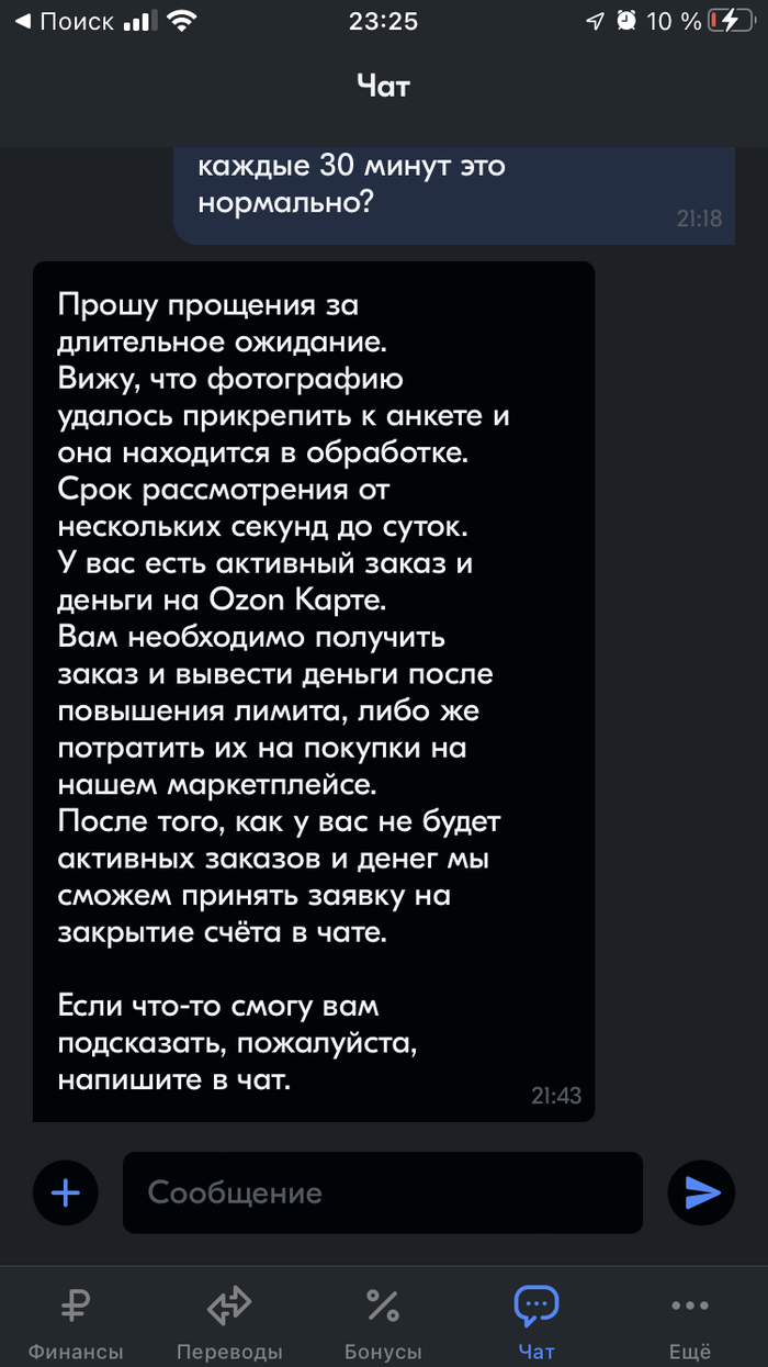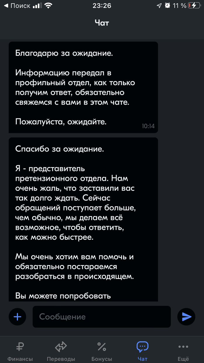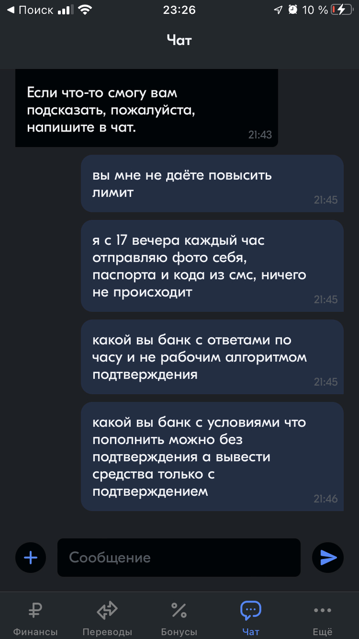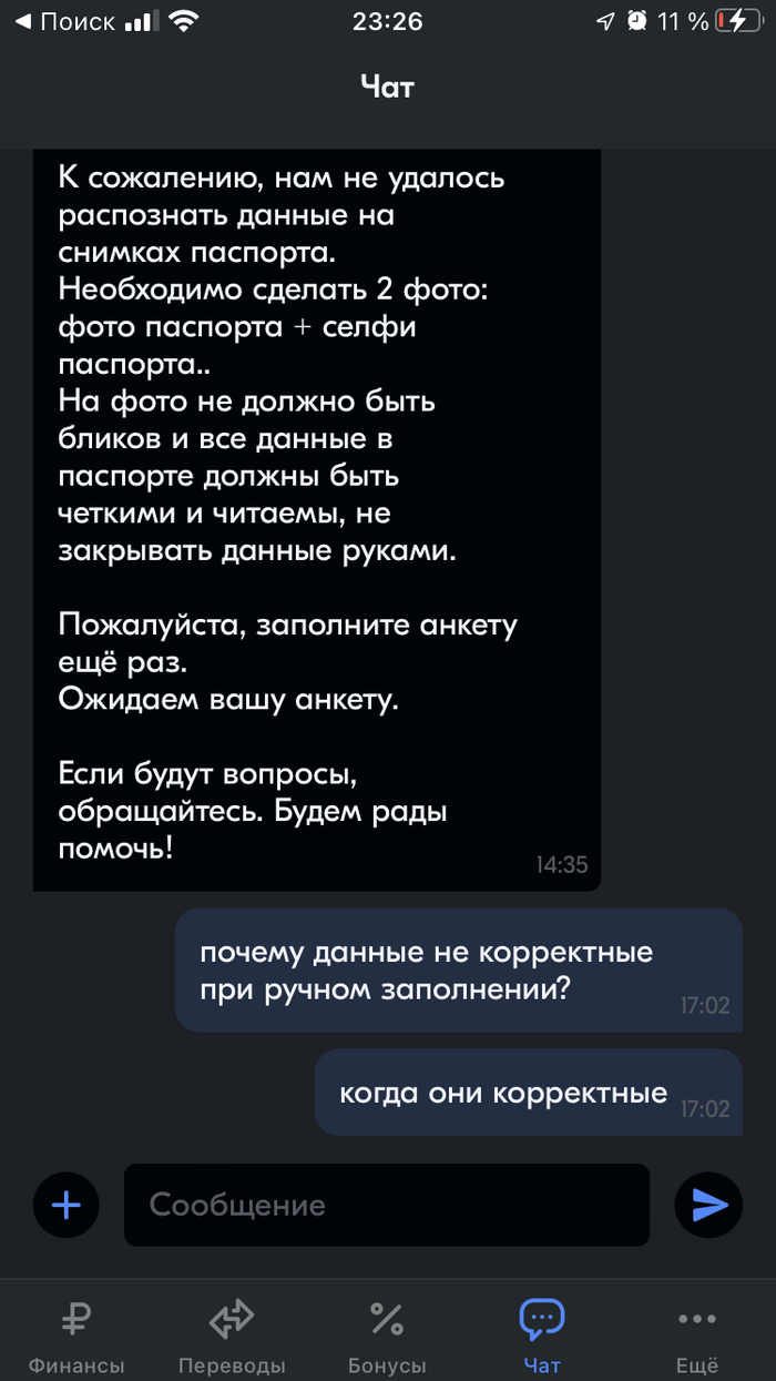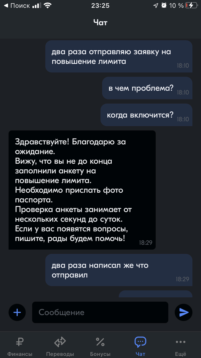 От бессилия бегу в чат (ведь по нашедшим двум номерам аля банка в гугле, я ответа от человека не дождался). Расписываю в чате что это издевательство и что данные я предоставил верные. На что получил ответ (10:14) «информация передана в профильный отдел», после (12:25) «представитель претензионного отдела» сказал что «мы делаем все возможное чтобы ответить как можно быстрее», после (14:24) мой «вопрос потребовал участия коллег из смежных подразделений» и наконец ответ (14:35) на то что почему выводится ошибка при заполнении «Базового лимита» (то есть не по фотографии, а в ручную) - «нам не удалось распознать данные на снимках паспорта» «Пожалуйста заполните анкету ещё раз» 🥲. Третий ошейник.