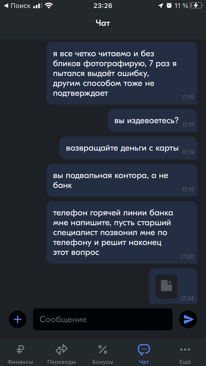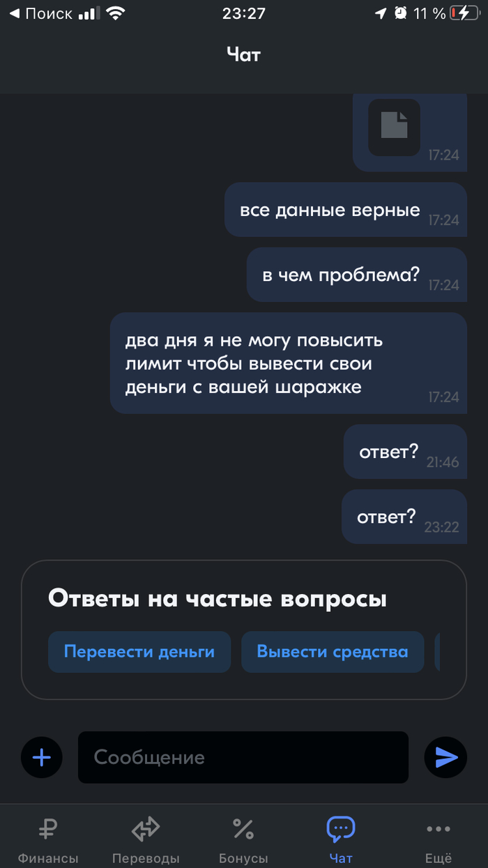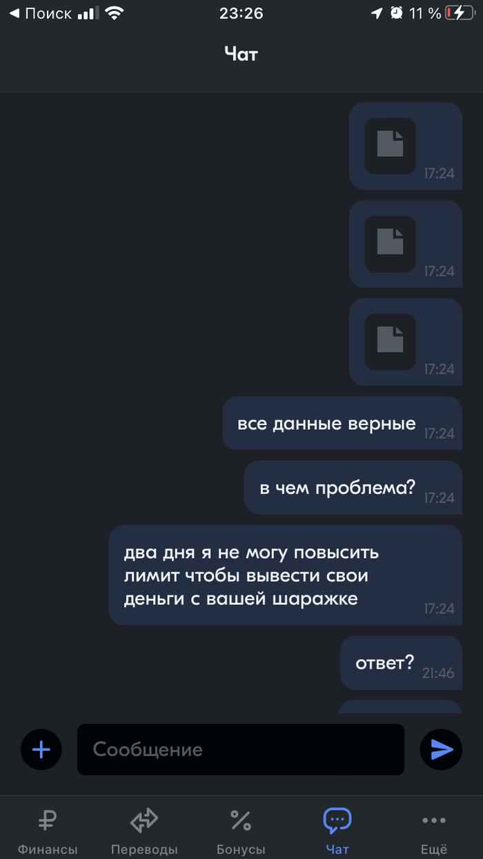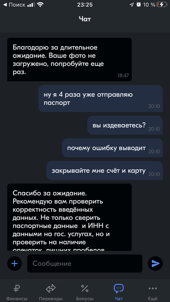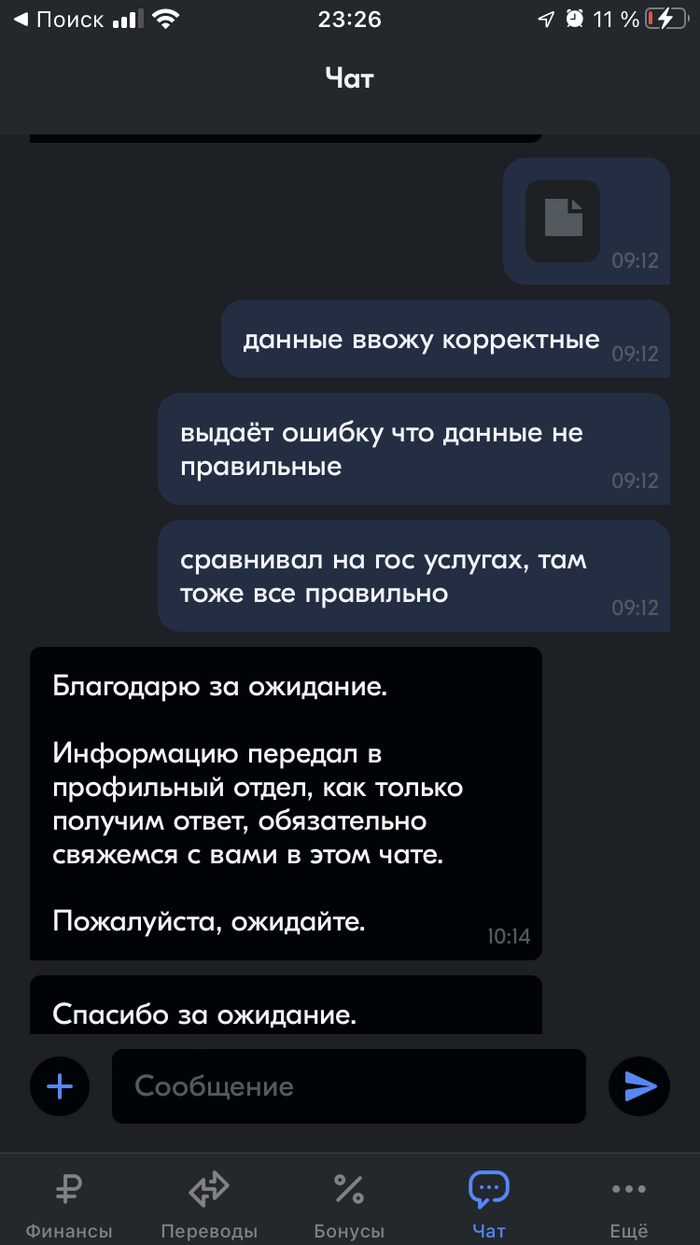 Написал я им ответ на это сообщения, приложил уже в чат им скан паспорта, инн и скриншот что все правильно введено, но выводится ошибка в 17:02, сейчас на часах 22:30, 5 часов 30 минут мне не может ответить «банк». Сутки я не могу решить проблему. Ожидания ответов между моими сообщениями и сообщениями этого ларька составляет от 30 минут до часа, ну вот только крайний раз почти в 6 часов вышел.