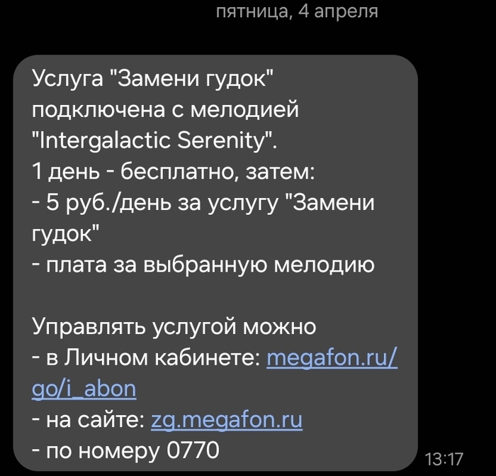 Лежу, смотрю фильм, как слышу звук уведомления на телефоне. Проверяю – мне подключили платную услугу "Замени гудок".