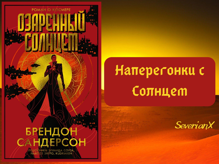 «Озаренный солнцем» – четвертый и последний из «Секретных проектов» Сандерсона (и третий прочитанный мной). Если предыдущие романы примыкали к вселенной «Космера» весьма условно (и планеты, и герои там были новые), то «Озаренный Солнцем» буквально насыщен отсылками. Правда мир здесь тоже новый, а вот главного героя мы уже встречали. За счёт этого роман является долгожданным подарком для фанатов «Космера», но крайне неудачной точкой входа для новых читателей. Привлеченные яркой обложкой и замечательными иллюстрациями, они рискуют попросту запутаться в обилии новой информации, которая практически не объясняется. Что за Инвеститура? Кто такие спрены? Какую роль во всём этом играет Хойд? Ответов на эти вопросы в романе вы не найдете. Поэтому, рекомендую сначала ознакомиться как минимум с циклом «Архив Буресвета» и только потом браться за «Озаренного».