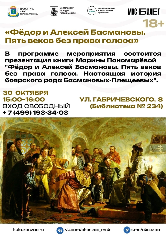 Эти планы вынашивались давно, но вызрели договоренности только в этом году. Наконец-то очередь дошла и до Москвы, дождались и наши московские единомышленники. 30 октября (15.00) читаю лекцию о Басмановых "Фёдор и Алексей Басмановы. Пять веков без права голоса" в удивительно уютном пространстве библиотеки на Габричевского. У выпускника Литературного института им. Горького поэта Сергея Шкарпеты и Александры Процкой. Это первая лекция о Басмановых в Москве (далее, 15 ноября выступаю на Крутицком патриаршем подворье) и первая лекция которая будет разбавлена стихами. А возможно на половину состоять из них :) Ибо отличительная черта данной библиотеки - это её творческая атмосфера, регулярно собирающая выпускников Лита и всех со-причастных.