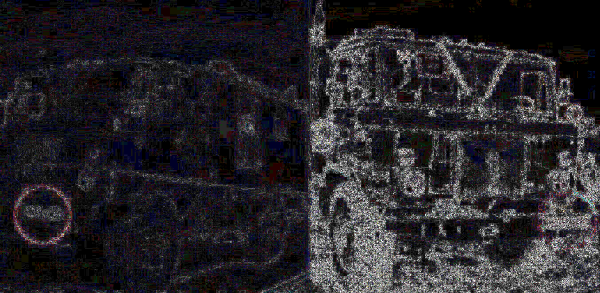 На кузове грузовика легко просматриваются заклёпки на листе, закрывающем кабину. Куда более крупные надписи на буке не читаются. Размеры блоков 8*8 на буке по ширине близки к размеру зеркала грузовика. Без всяких программ я бы утверждал, что это фотошоп, при котором бук отмасштабирован с последующим наложением поверх грузовика.