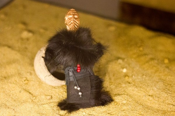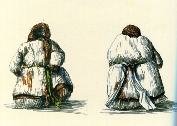 Мужские - в ситцевые рубашки, кафтаны, пояса, малицы - одежды из сшитых оленьих шкур. Любопытно, что о благосостоянии кукол тоже заботились. Так в одном разрушенном доме нашли иттарма под первой рубашкой которой были положены два кредитных билета по 100 и 1000 рублей 1918 года.