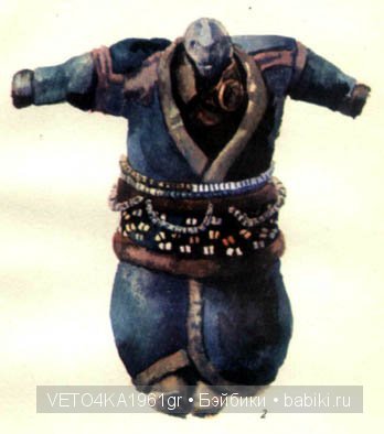 Подобные фигурки представляют собой туловище без головы и рук, или они есть, но слишком маленькие, а голова лишена лица, либо оно едва намечено Напрашивается аналогия с палеолитическими “венерами”, у которых нет рук, голова весьма “условна”, а сами они безлики. У хантов такая кукла была длиной 20-22см. Причем некоторые старые ханты делают такие фигурки до сих пор!