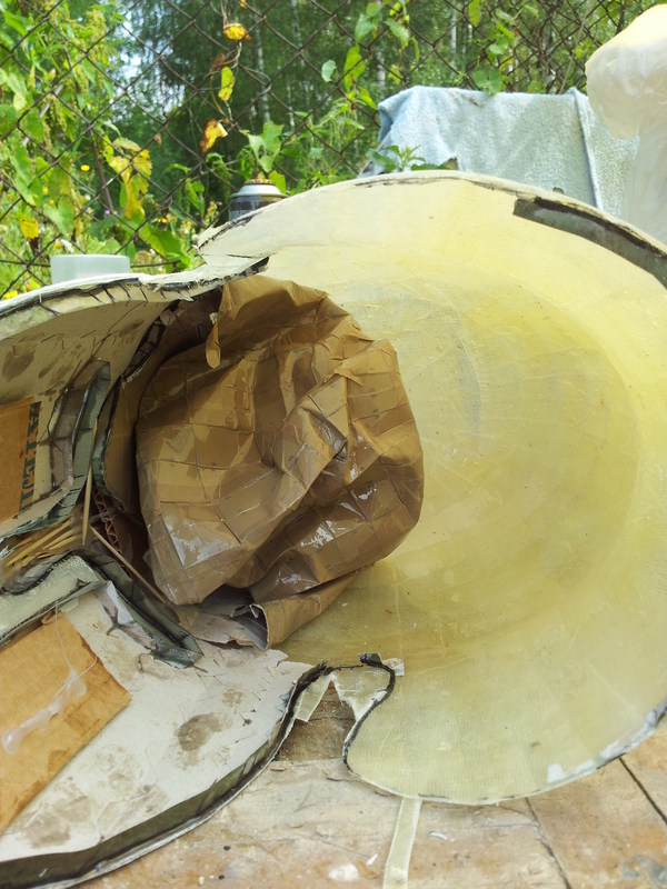 Всю внешнею поверхность я обклеил прозрачным скотчем это для того что бы потом было легче отделить бумажную часть от стеклопластика.
