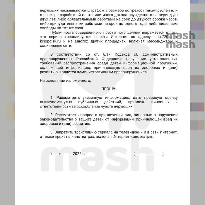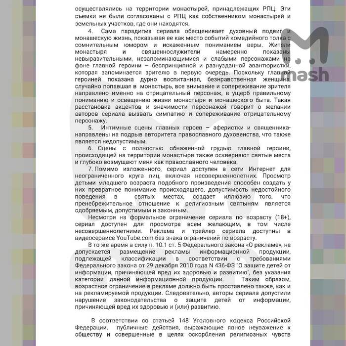 Также заявителей смущает доступность сериала. Несмотря на ограничение 18+, на осквернение всего и вся может смотреть любой дошкольник. Поэтому всех причастных к выпуску сия просят проверить, наказать годом тюрьмы по 148 статье или штрафом в 300 тысяч рублей, а стриминг запретить.