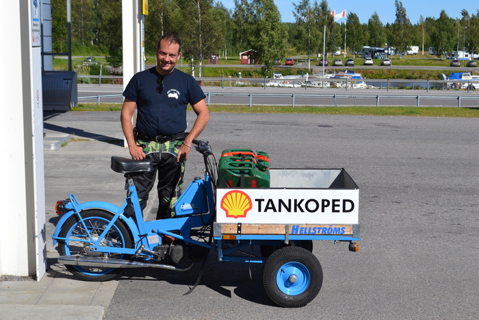 Только отъехав от гостиницы, мы внезапно покидаем Финляндию. Знак «Швеция» расположен непосредственно на круговом движении, даже не сфотографируешь. Намотав на кардан ещё сотню километров идеального шведского шоссе, мы останавливаемся залить полный бак и неожиданно видим кусочек синей Балтики, Аня фотографирует меня на фоне моря и забавного «Танкопеда».