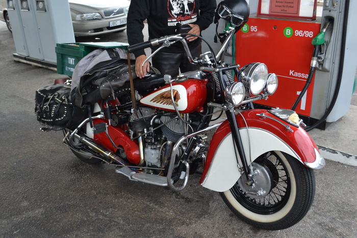 Съезжаем с шоссе на заправку, на самый берег круглого лесного озера, где прогуливается семейство гусей. На соседней колонке заливается мужик на «Индиане» 1948 года в безупречном состоянии. Достает из кофра маленькую канистрочку и добавляет в бензин масло. Я заинтригован, начинаю разговор. Оказывается, старинный дефорсированный мотор плохо переваривает высокооктановый бензин, поэтому хозяин подмешивает масло.