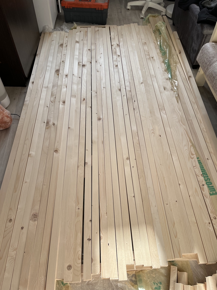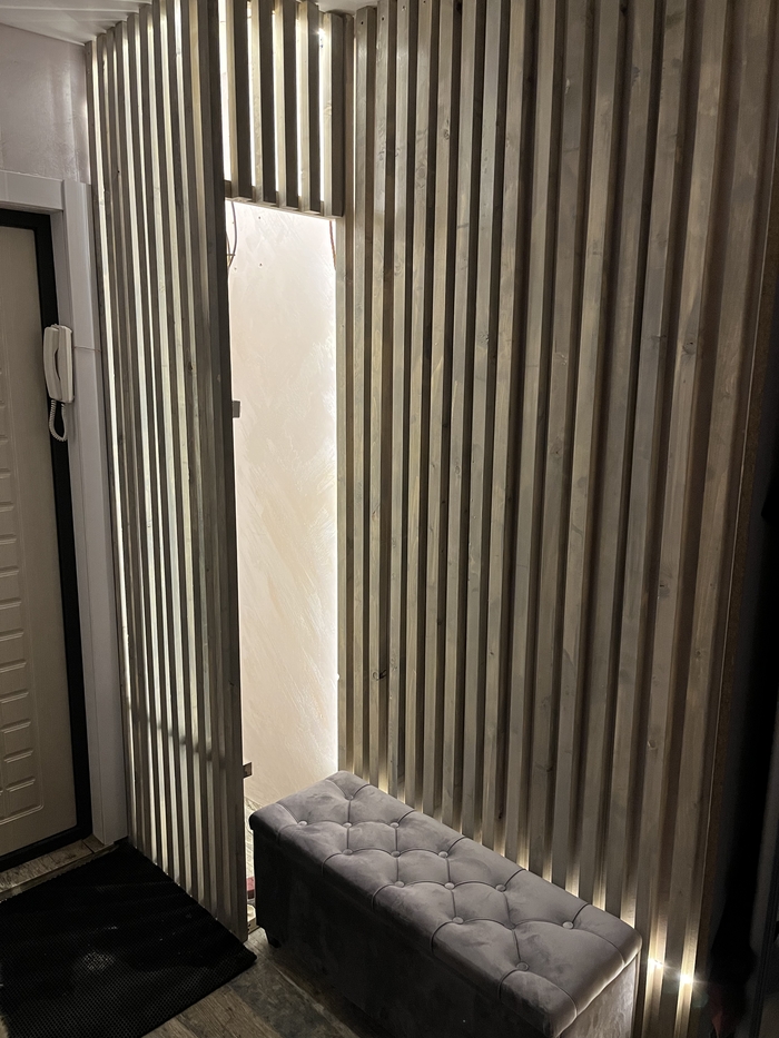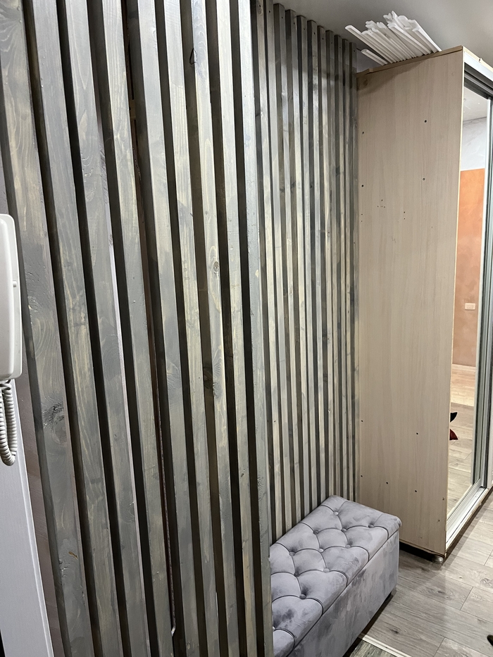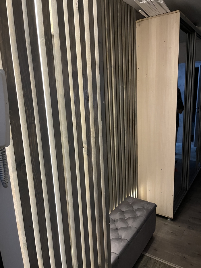 Сразу для тех кто будет кидать тапками в комментариях что лучше использовать декоративный шпонированный мдф. Цена МДФ у нас 700 рублей 3 метра,строганый брусок 100 руб 3 метра.поэтому тут показано решение дешево сердито.