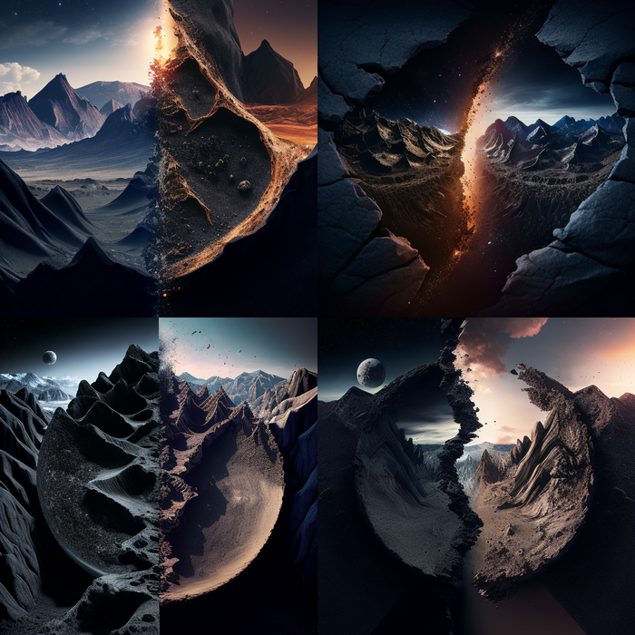 Для начала мне захотелось, чтобы нейросеть нарисовала мне планету пережившую глобальный катаклизм. У планеты отсутствует северное полушарие. Вместе него хаос из астероидов. Южное осталось целым. Сохраняется (благодаря определенной технологии) атмосфера и жизнь. По линии разлома стена из черных и неприступных гор. Миссия для нейросети невыполнимая. Получив превью, я не стал больше ее мучать. Стоит заметить, что картинки вышли довольно-таки интересные, но сути они не смогли передать.