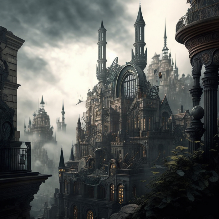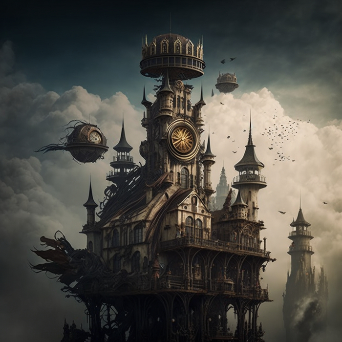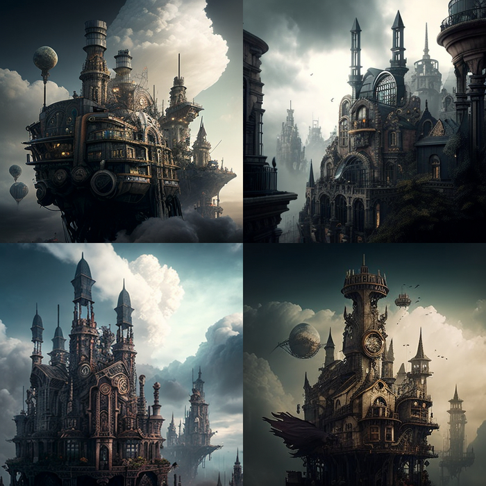 Двигаемся далее. В очередном запросе я сделал краткое описания города инженеров, исследователей и изобретателей. Город Микея расположен на острове, парящем в небе, среди облаков. Слово стимпанк так же использовал в качестве ключевого.