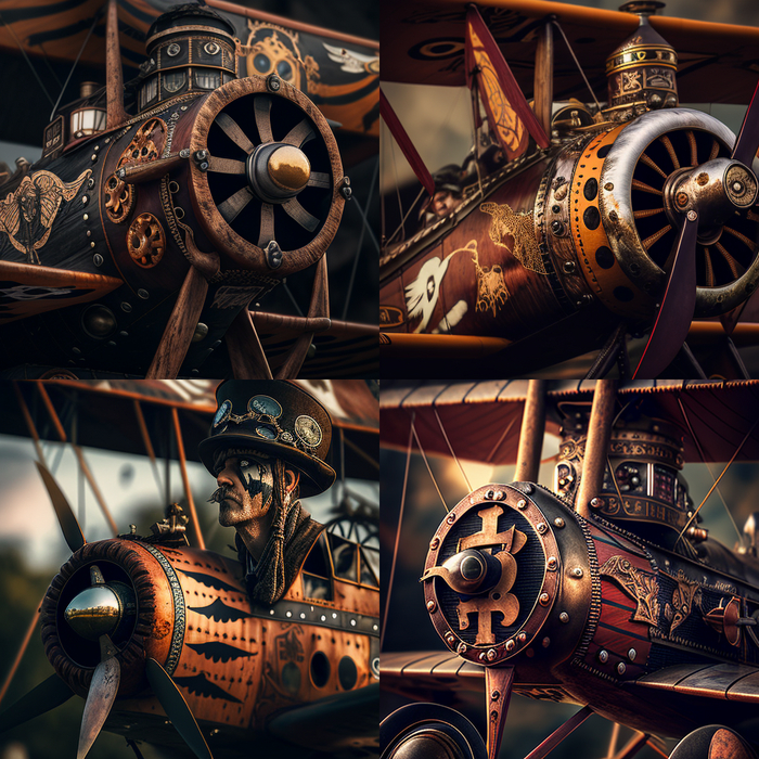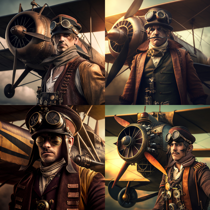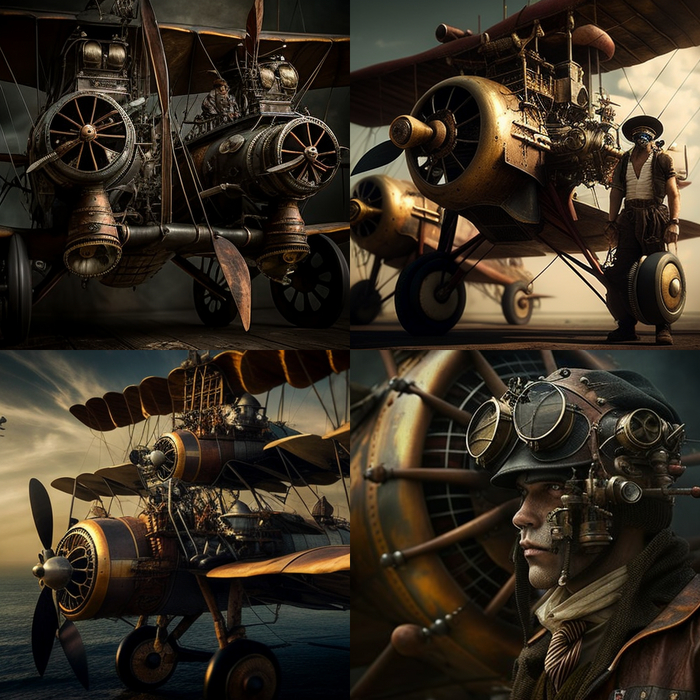 Обратите внимание на пилота с третьей картинки. Что-то интересное в нем есть. Я определенно запомню и использую этот образ.На некоторых картинках нейросеть явно перемудрила с фюзеляжем, кабиной, колесами.