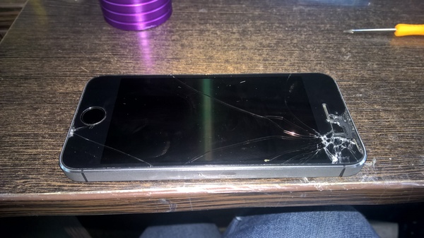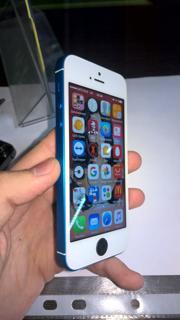 Яблоко на которое упал блин 25 кг, желание клиента было очень сильно экономить на запчастях, белый с голубым цвет корпус, а так же рабочий сканер отпечатка.
