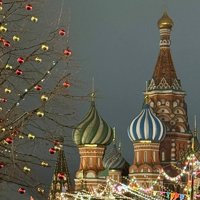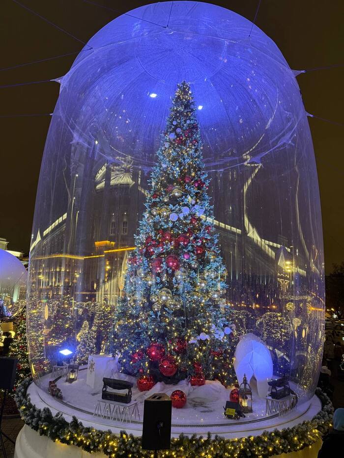 На Манежной площади появилась величественная ель высотой 22 метра, усыпанная гирляндами общей длиной пять километров и украшенная десятью тысячами игрушек, расписанных вручную. Все элементы декора были созданы московскими мастерами по уникальным эскизам, включая сцены из рождественских сказок, шелковые флажки, длинные золотые и серебряные сосульки, а также фигурки ватных человечков и куклы в нарядных праздничных костюмах. Дерево доставили в столицу из Тверской области.