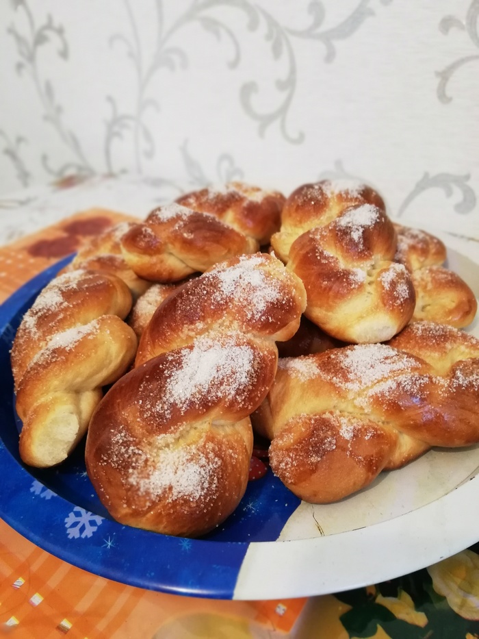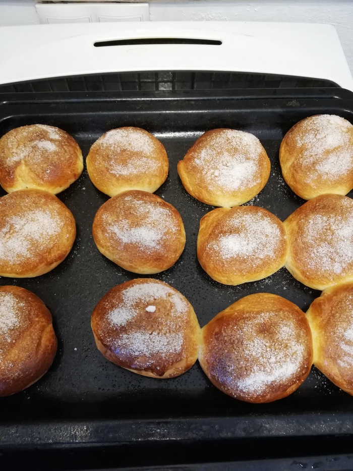 Ставим наши булочки в тепло, они должны увеличиться в размере раза в два. Я обычно разогрева духовку до 50 градусов и там подходят мои булочки. Затем, пока разогревается духовка до 220 градусов, я смазываю булочки взбитым яйцом и посыпаю их сверху сахаром. Форму своим булочками можете придать какую угодно.