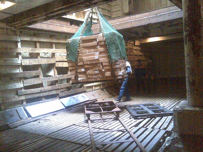 Я конечно не особо парился, не смотря на то что это было в четыре раза больше (и это не полный груз), чем обычно выгружали на омуле.. Но фишка была немного в другом. Ящики. Они были уже не по 30, а в среднем по 25 кг (в самом худшем случае), и пи*дец какие неудобные..
