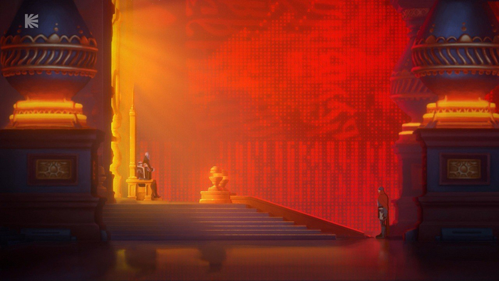 Хоть пейзажи и архитектура отдают 3d-моделированием, выглядит всё интересно. Хвойный лес прекрасен. Иногда проскальзывают такие словечки, как «давеча», прямо славянское технофэнтези. Даже огромный тронный зал, похожий на зал для аудиенций Чойо Чагаса из «Часа быка» от студии «Думай сам/думай сейчас», огромен и переливается красным светом в противоположность синему, как две силы из далекой галактики.