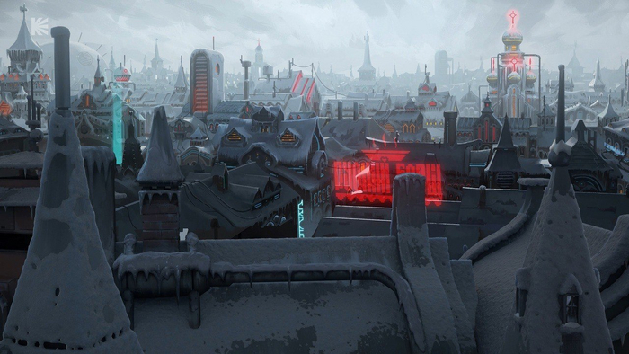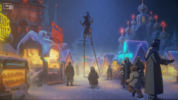 Здесь также есть разные референсы на реальные здания: дом купца Игумнова, где расположено Французское посольство, Исторический музей в Москве, колокольня из ансамбля Вологодского кремля, построенную в XVII веке. Неоновые купола точно стали фишкой создателей «Киберслава».