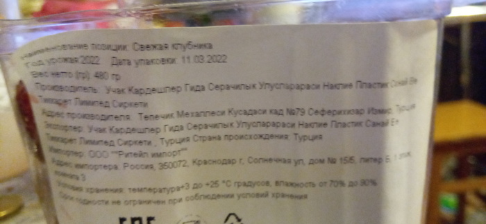 Прошу прощения за не очень качественное фото,но смыс ясен. У данной клубники неограниченный срок хранения. О как! Сейчас запрсила информацию по сертификатам качества у магнита и пишу заявление уже в прокуратуру. Клубника,которая может хранится бесконечно.. Офигеть.