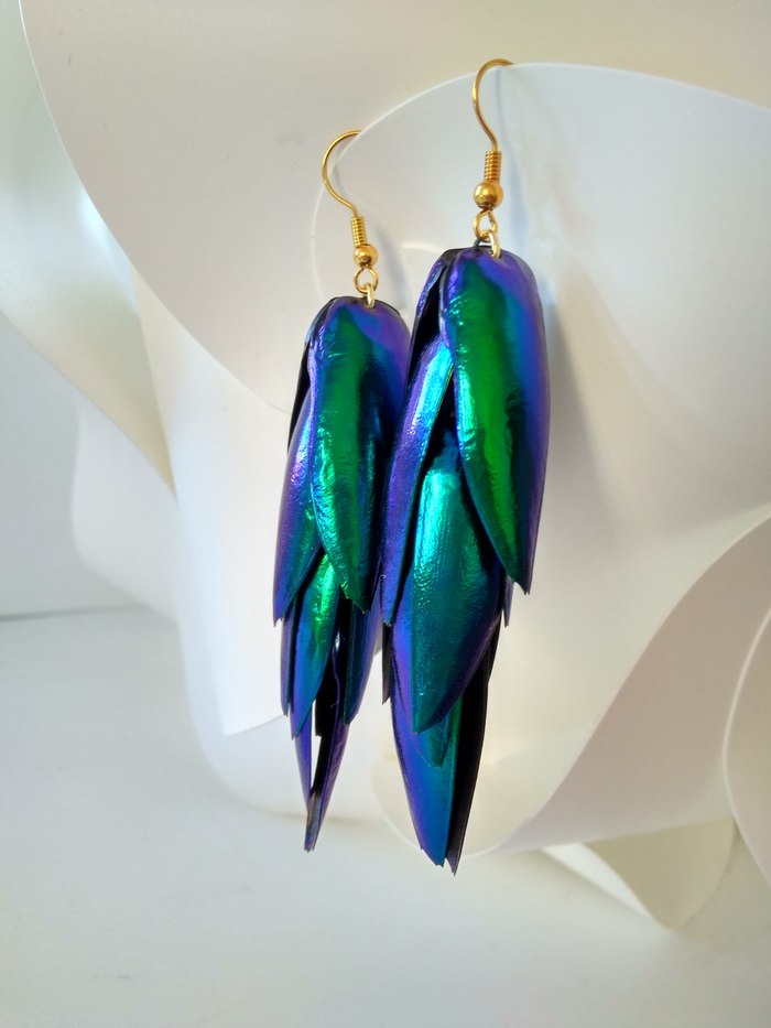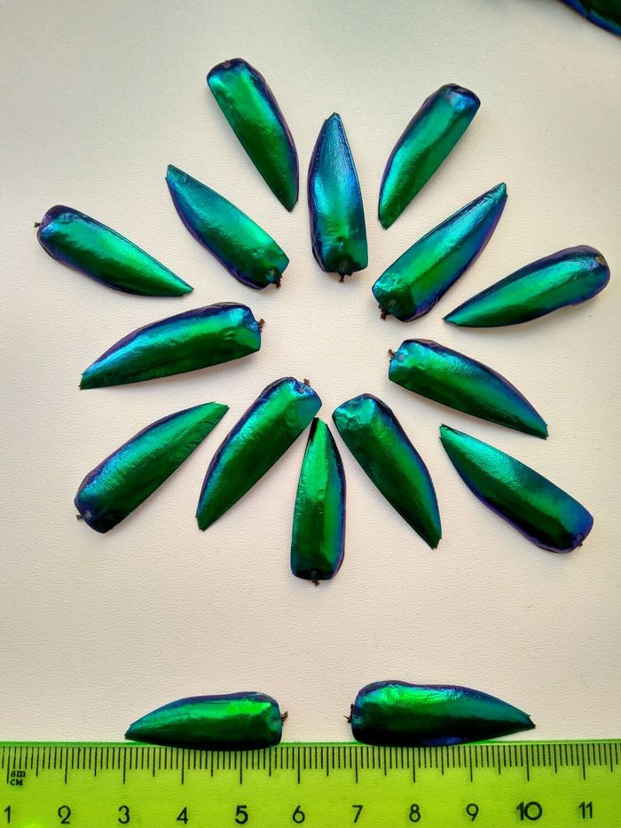 И вот тут начинается их вторая жизнь. Жуков любовно собирает местное население тропических лесов. Ходят слухи, что они их даже едят! Но нас интересуют элитры. Крылья сохраняют блеск и цвет в течении многих десятков лет. Цветовая палитра довольно широкая, а смотреть на них невероятное эстетическое удовольствие.