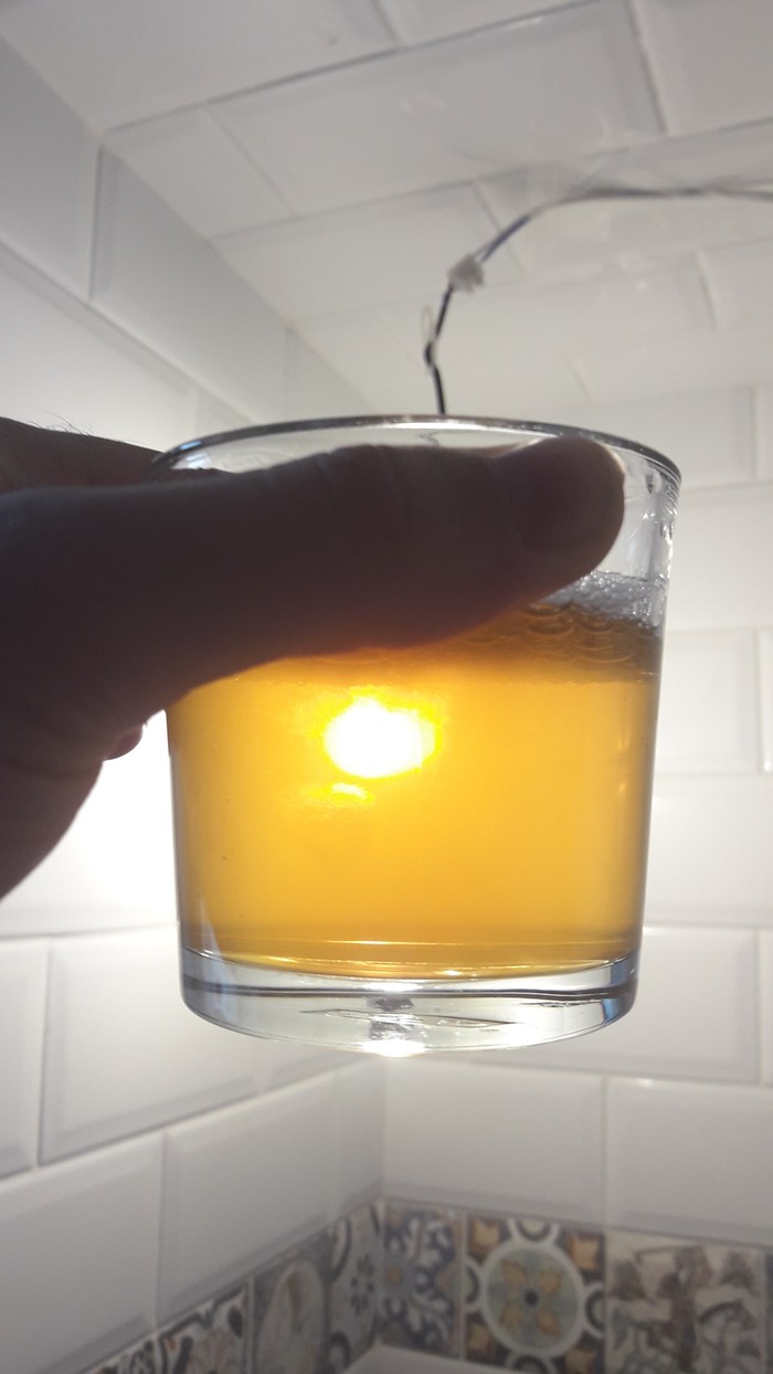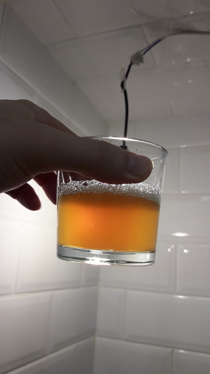 Для эля, по моему мнению, вполне нормальная прозрачность, хотя за 2 недели брожения, да ещё с переливом он несколько осветлится. Но это мы узнаем пожже. Пробовать на этом этапе особого смысла нет - сусло сладко-горькое с хмелевым ароматом.