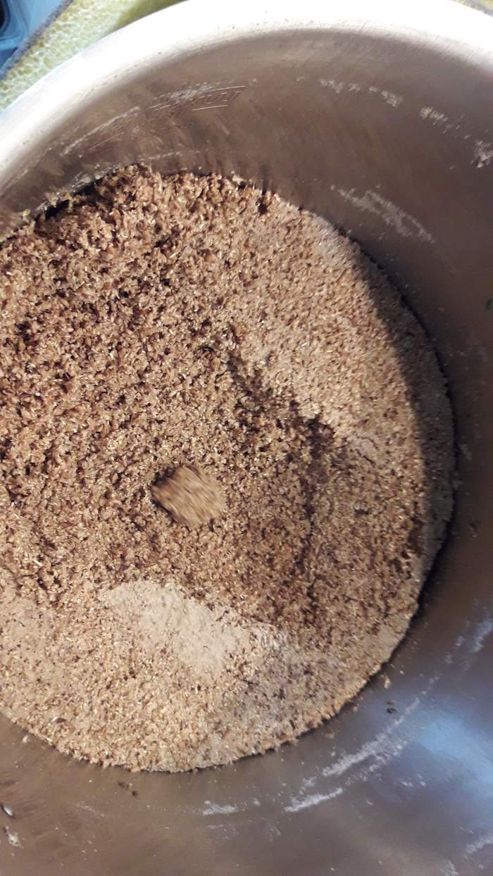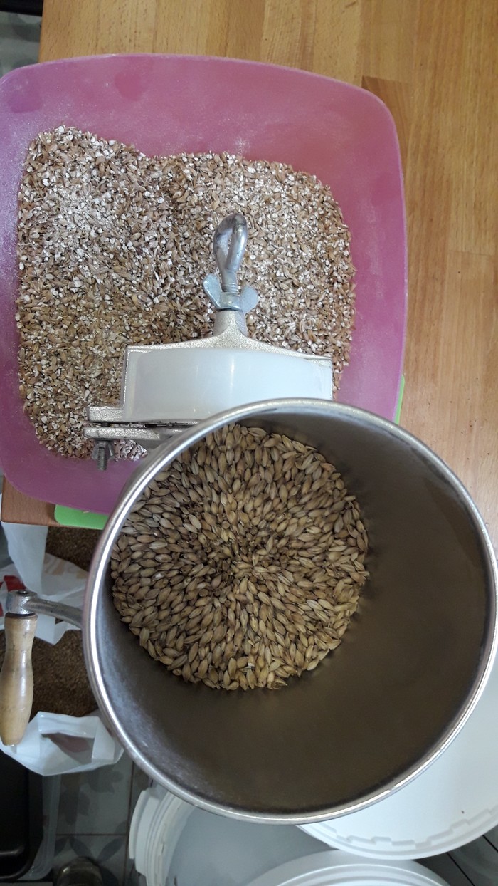С помощью адской машины, которую несомненно высрала сама преисподня, перемалываем солод. на такой объем уходит 40-50 минут ручного труда. Дело нетрудное, но пыльное и монотонное. Радует, конечно, что за окном промозгло и сыро, а дома тепло.