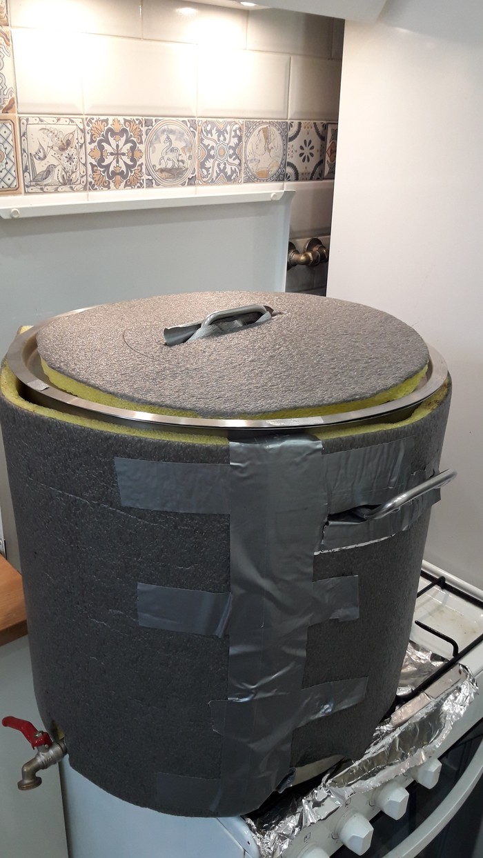 Еее. Именно так выглядит битый жизнью пепелац, обёрнутый утеплителем. Да, где-то уже оплавилось, да куска не хватило по длине, пришлось соединить, и таки да, он работает - сохраняет нужную температуру нужное время. Пауз планировал я 2, соответственно после первой, нагреваем до следующе (и так далее). Перед второй паузой, попутно с котлом грею воду в 2х кастрюлях, суммарно 12 литров, она понадобится для промывания.