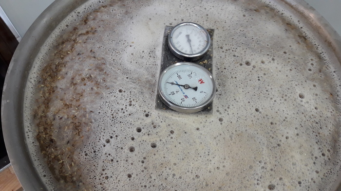 Закипает в 16:40. Варка длится 1,5-2 часа. В процесе варки, в зависимости от рецепта пива, в сусло вносится хмель. В начале варки для хмелевой горечи. За 15-20 минут до конца для хмелевого вкуса. И минут за пять до конца для аромата. Ещё можно внести пряности или другие компоненты (имбирь, цедру), но для моего эля оно всё ни к чему.