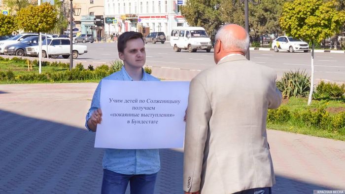 Одиночный пикет с требованием исключить из школьной программы произведения Солженицына провел координатор новочеркасского отделения движения «Суть времени» Дмитрий Тимонин 27 апреля, сообщает ИА Красная весна.