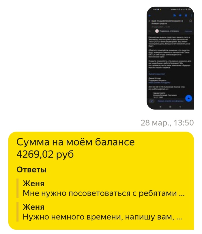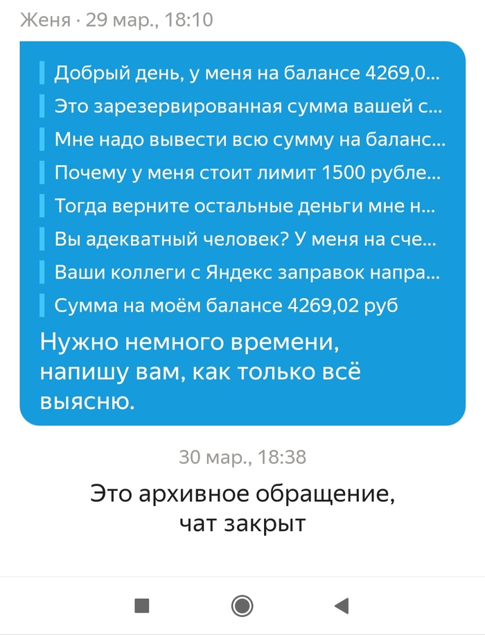 Чуть меньше года работал в такси. Деятельность была, как основной заработок. С поддержкой были курьёзы, но я забивал на это и работал дальше. Но вот, случилось то, что решил я завершить данную деятельность и вывести зарезервированные денежные средства. Резерв состоял из Яндекс.Заправок(1500руб которые мне вернули) и другой части, которой я не совсем понимаю на что они зарезервированы. Возможно на покупку смен для работы без комиссии, но не суть.