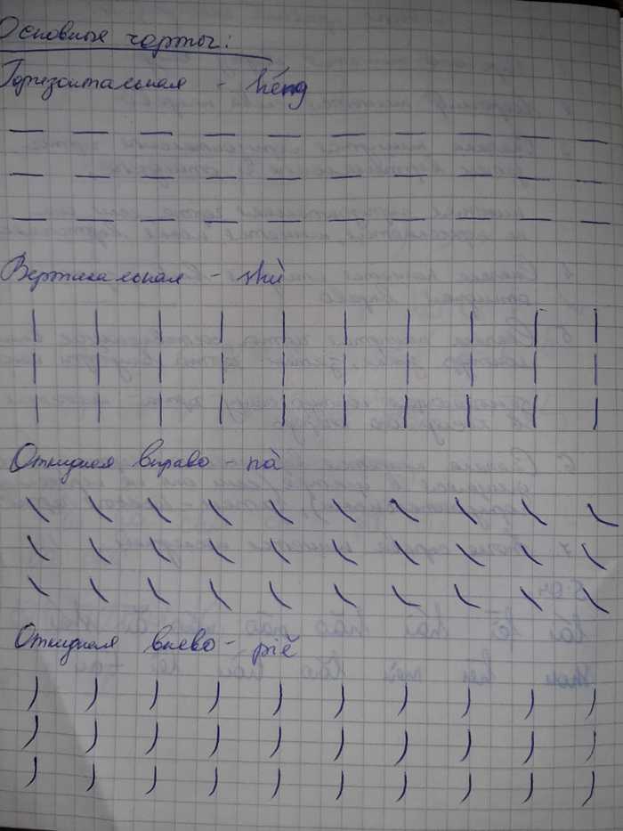 А что же с чертами? А черты прописать надо, господа.. Каждую по три строчки. Даже точке отведем три строчки. И попробуем их вписать в систему мировоззрения традиционных китайцев (а именно: в четыре клетки (квадрат), и гармонично располагая их ближе к центру). А чтобы не было ощущения, что вы какой-то фигней занимаетесь, прикрепляю вам свою рабочую тетрадь с первого курса (специально нашла свои первые черточки и закорючки). Вот, можно посмеяться: