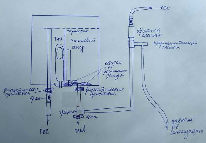 4. Обратный клапан постарайтесь поставить выше нижнего уровня бака (дна), иначе может забиться остатками анода.