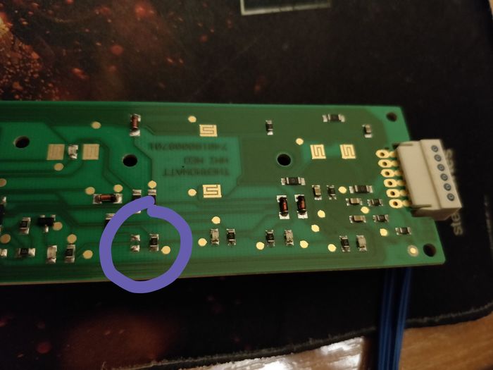 P.S. Новый нагреватель попался с браком. Не светилась лампа на блоке управления при 70 градусах. Разобрал блок управления – на заводе просто «забыли» впаять светодиод отметки 70 градусов в схему (на фото ниже). Обратно в магазин не потащил, просто стало лень сливать воду, раскручивать резьбовые соединения, паковать и тащить обратно – переставил схему со старого нагревателя, они один в один, все работает.