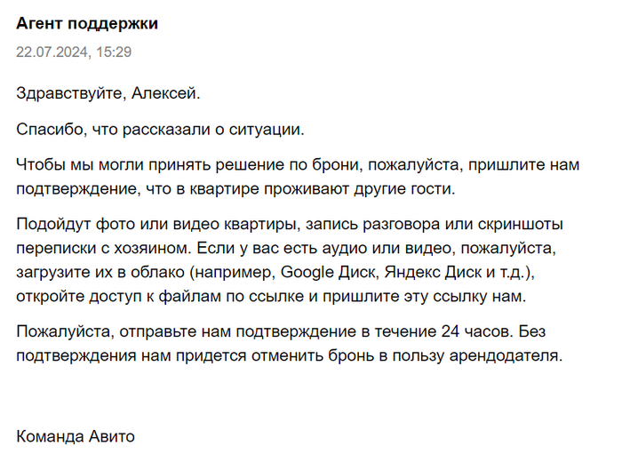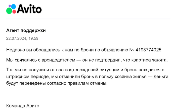 Обратился в тех поддержку Авито. Я был уверен что они помогут, так как изначально мне отказал арендодатель через звонок через их же предложение. Они зарегистрировали обращение, и пообещали разобраться.