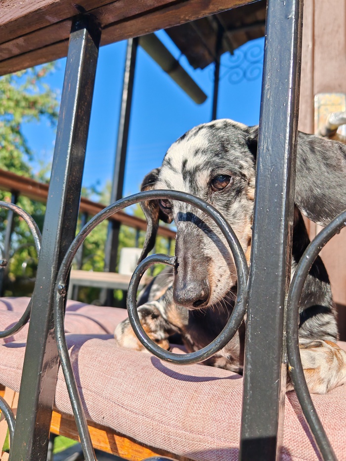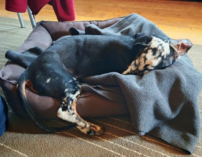 Барсучок сейчас тусит на даче. Лето нестандартное настолько, что иногда приходится утепляться. Чувствуется возраст, 16 лет, сейчас много спит, меньше ест и двигается, иногда даже вместо вечеринки предпочитает зарыться под одеялко в свою корзину. Вечером недоволен, когда долго сидим на улице, все время пытается зазвать в дом, там теплее, нет ветра, нет комаров. Поэтому сейчас в приоритетах комфорт.