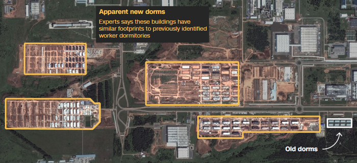 На снимке от 12 июля видно по меньшей мере 104 одинаковых прямоугольных здания, полностью или частично построенных, с такой же площадью застройки, как у существующих зданий, которые, как известно, являются общежитиями для рабочих. На снимках, сделанных в феврале, таких зданий было всего 15. Судя по всему, работы по строительству новых зданий начались в марте, когда наступила весна и растаял снег.