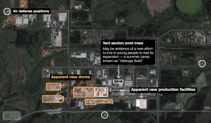 Палатки, в которых будут жить студенты, которых не было видно на спутниковых снимках от 9 июня, появились в полном объёме к 12 июля. По подсчётам CNN, рядом со складами, связанными с производством дронов, было установлено более 100 палаток цвета хаки, похожих на те, что были показаны в постах «Алабуга Строил» в VK.