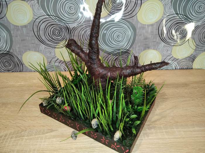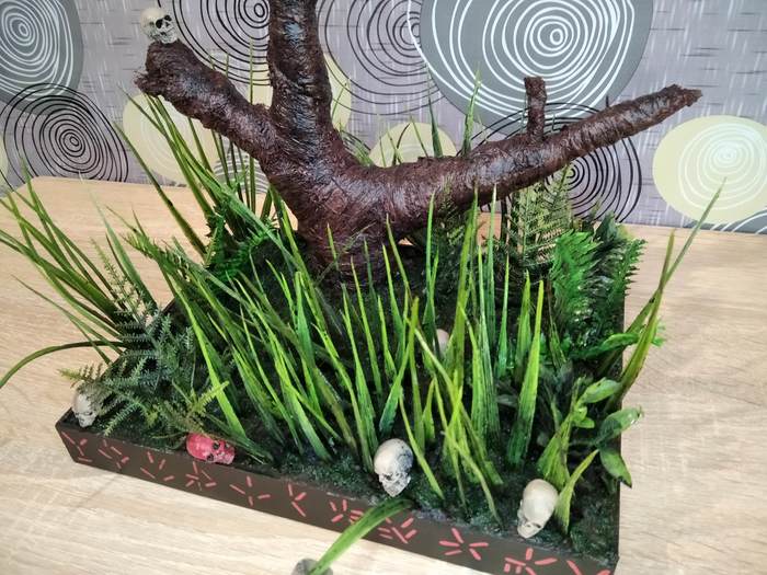 Основание диорамы сделал из листового пластика ПВХ толщиной 3 мм, в каркас заливал скульптурный гипс. Дерево делал из нержавеющей проволоки, сантехнического льна и суперклея. Красил акриловыми красками для моделизма ХОМА. Растения брал из наборов для аквариума, прямые растение - искуственная трава "Осока". Размер диорамы 30 см длина, 23 см ширина, 27 см высота. На работу понадобилось 3 недели.