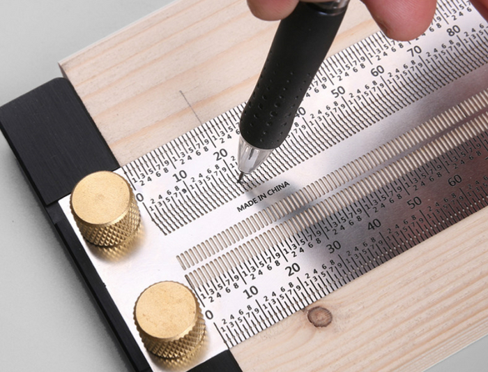 Так же благодаря отверстиям в линейке и опорной пяты, можно размечать параллельные линии относительно кромки материала.