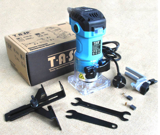 Станок имеет съемную опорную платформу, с возможностью установки глубины реза. Фрезы с хвостовиком 6.3 мм крепятся при помощи цангового патрона на валу ротора двигателя.