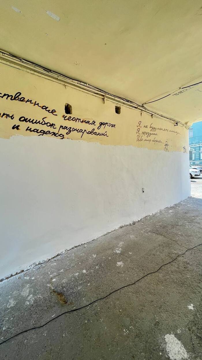 В Уфе есть двор Сергея Довлатова, оформлен симпатично, на стенах цитаты и рисунки, было красиво-приемлемо. И на входе в этот двор была арка, тоже с рисунками и цитатами — вот так она выглядела: