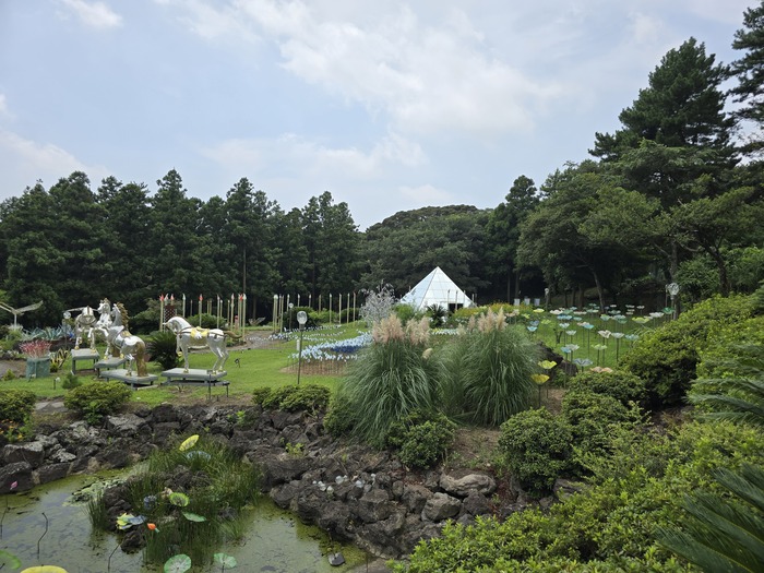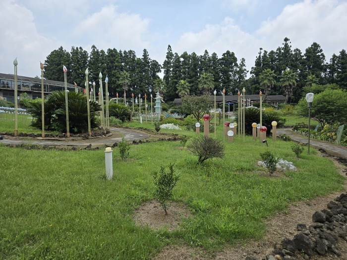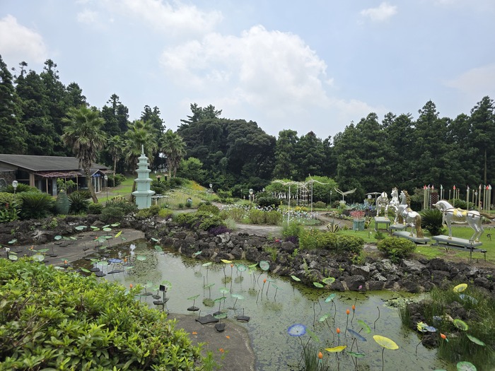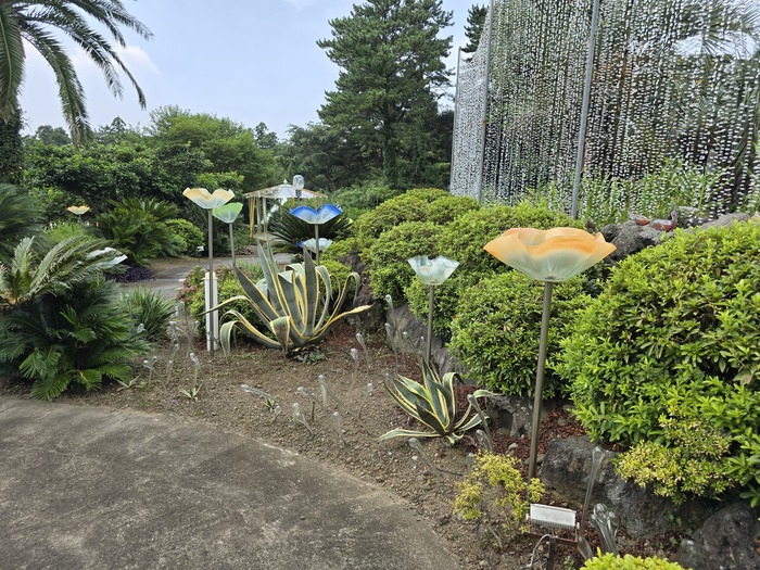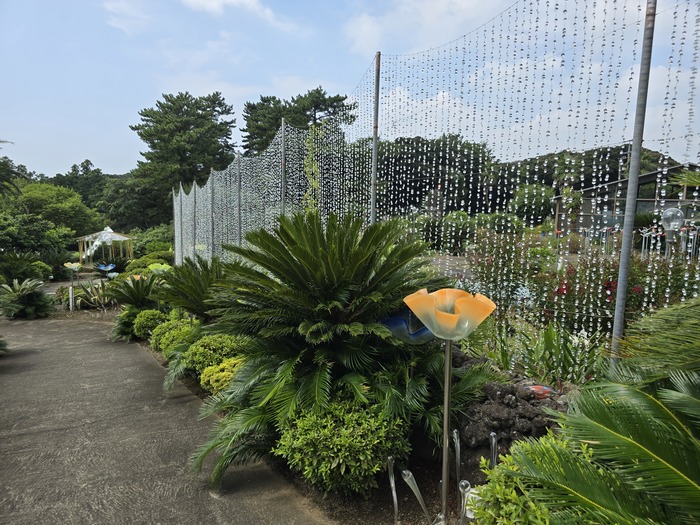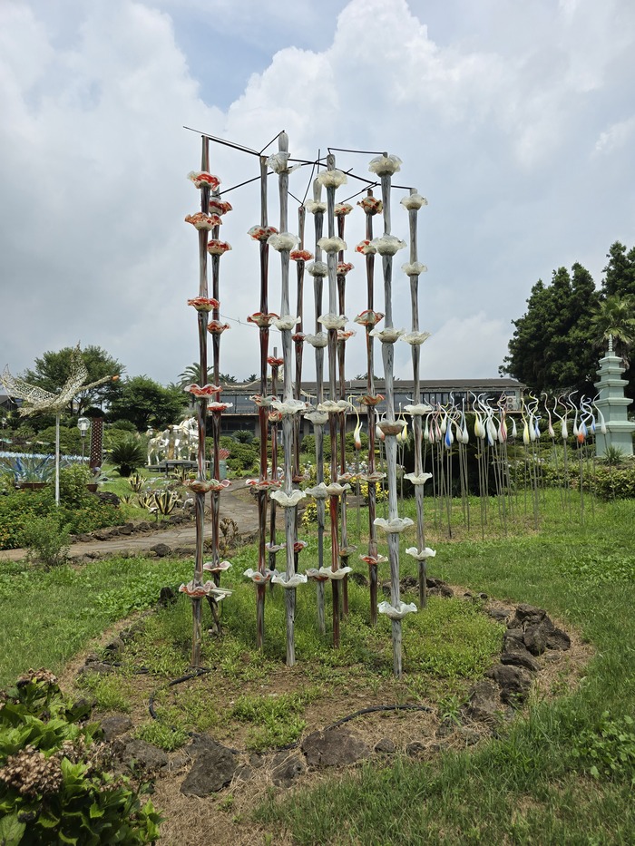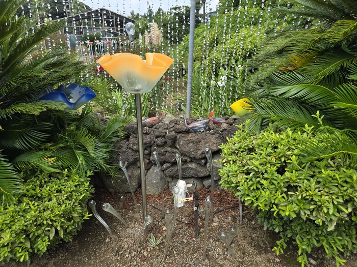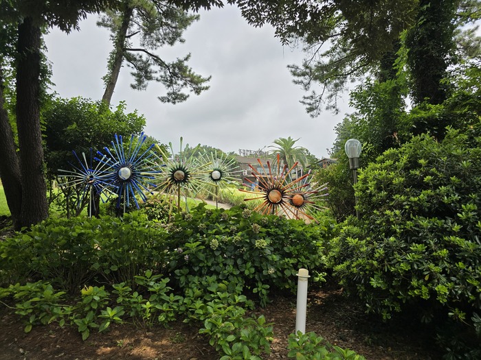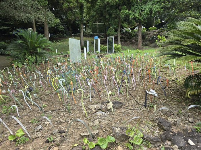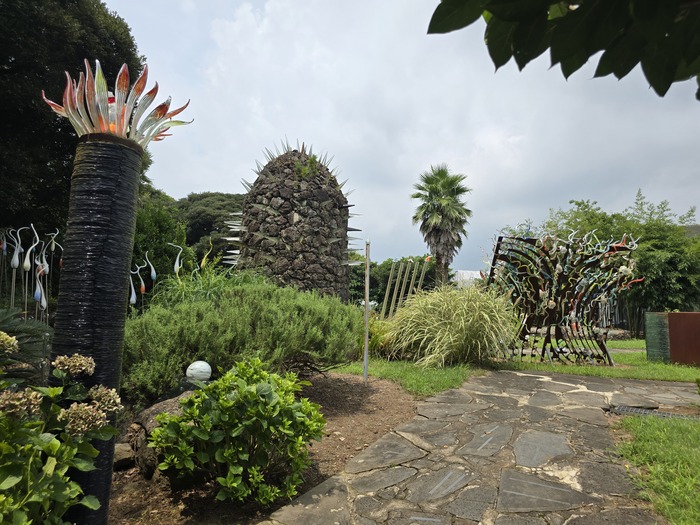 До сих пор под сильным впечатлением – филигранность работ просто поражает. Короткий спуск от кассы, по пути цветочки и висюльки – так как территория большая, рельеф местности успевает сработать, и вся выставка расположена на перепадах высот.