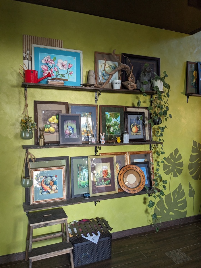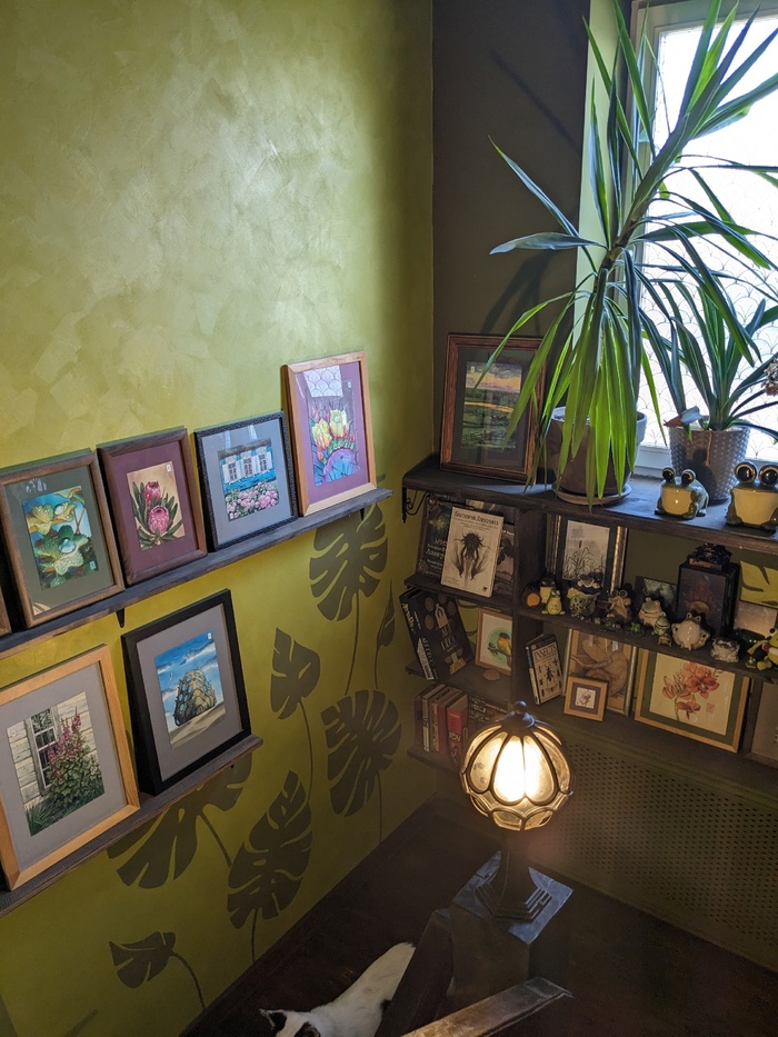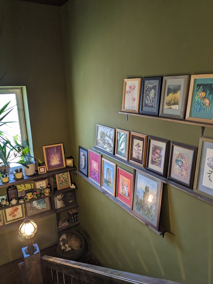 Большинство своих акварелей я не продаю, только печатные копии или файл для самостоятельной печати. Муж соорудил на лестничном пролете полки под мои картины где они ждут следующей выставки...