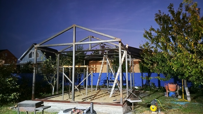 Варил сам. Осталось прогоны на крыше сварить и дверной проем. Погода испортилась сейчас.